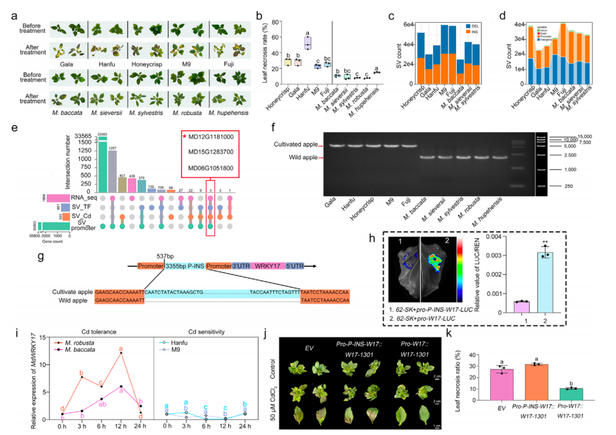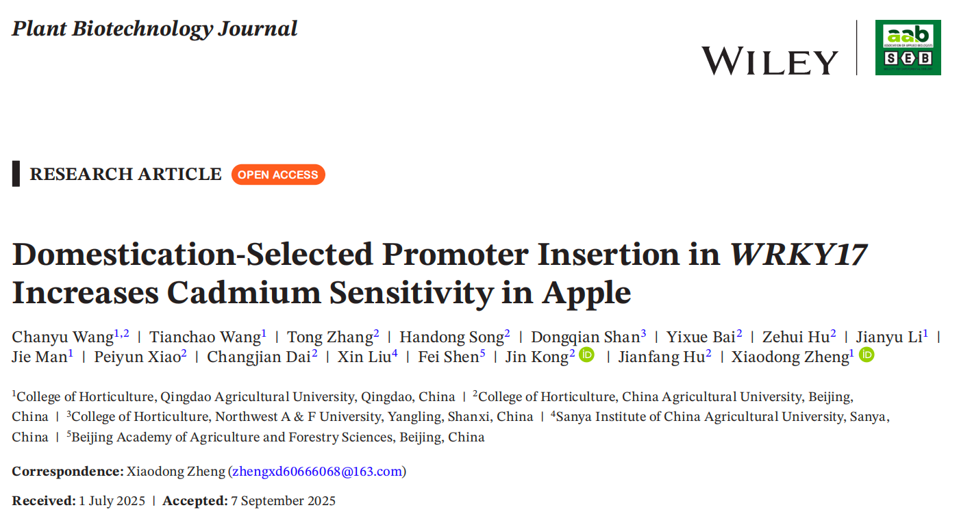近日,365英国上市果树生物技术与种质创新团队联合中国农业大学和北京农林科学院生物技术研究所在Plant Biotechnology Journal上发表了题为“Domestication-selected Promoter Insertion in WRKY17 Increases Cadmium Sensitivity in Apple”的研究论文,系统揭示了栽培苹果与野生苹果在镉抗性方面差异的分子机制。该研究指出,转录因子WRKY17启动子区的一个自然变异插入是导致两者抗镉能力差异的关键因素,并深入解析了WRKY17参与镉胁迫应答的新机制。