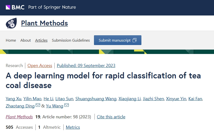 2023年8月27日,茶树育种团队在Plant Methods 发表了题为“A deep learning model for rapid classification of tea coal disease”的研究论文。365英国上市正高级实验师王玉为论文共同通讯作者,365英国上市茶学专业在读硕士研究生徐阳为第一作者。该研究得到了山东省茶产业技术体系首席专家项目、山东省农业良种工程项目、山东省农业科学院创新项目和山东省泰山学者专项基金等的资助。