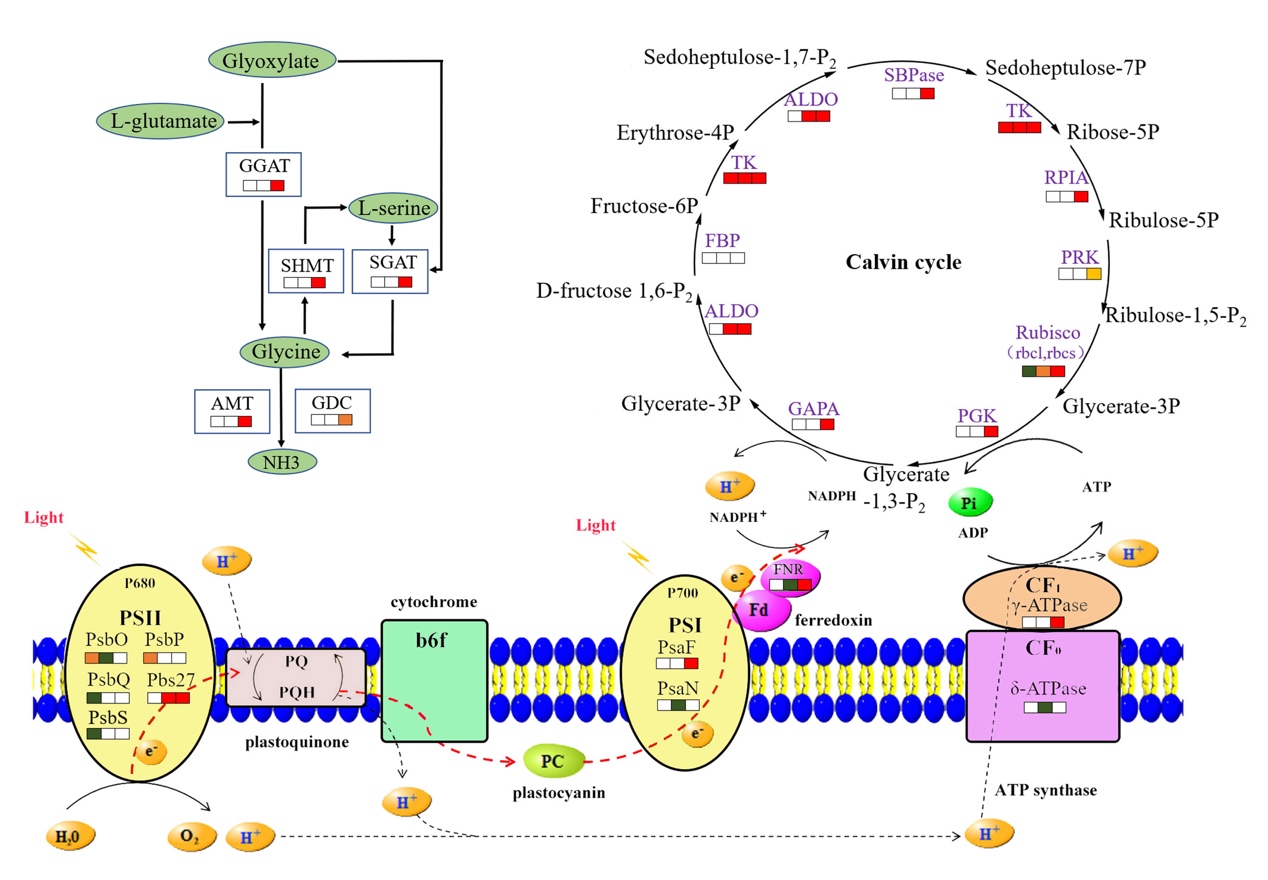 该研究发现,在铵复供条件下,茶树叶片中的971种蛋白质上存在2288个赖氨酸巴豆酰化修饰位点。其中,大多数巴豆酰化修饰蛋白位于叶绿体和细胞质中。与铵缺乏相比,在铵复供3小时和3天分别有120和151个巴豆酰化修饰蛋白差异表达。这些修饰蛋白主要参与茶树初级代谢过程,如光合作用(PsbO、PsbP、Pbs27,PsaN、PsaF 和 FNR),碳固定(rbcs、TK、ALDO、PGK 和 PRK)和氨基酸代谢(SGAT,GGAT2,SHMT4 和 GDC)。