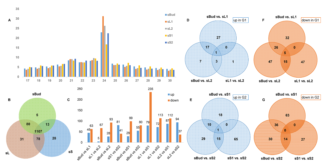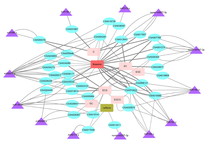 基因网络是茶树新梢生长与发育的调控中心。为了进一步探讨茶树在新梢发育和品质形成过程中关键的miRNA,研究者以4年生‘平阳特早’茶树植株为材料,分别对顶芽、芽下第一叶、第二叶、第一茎节和第二茎节共5个组织进行了miRNA和转录组测序,共建立了15个miRNA文库和mRNA文库。研究者重点定义了茶树中的保守miRNA家族,并分别以芽-一叶-二叶和芽-一茎-二茎两个发育模式分析了芽、叶及茎发育阶段有关的差异miRNA表达谱;研究者通过对新稍中特征性代谢产物茶多酚包括GC、EGC、C、EGCG、EC、ECG,以及咖啡碱和茶氨酸进行定量测定,并与miRNA组和mRNA组进行联合分析,研究发现21个保守miRNA和8对miRNA-TF对最有可能参与调控新梢发育,筛选到至少有2对miRNA-TF-代谢物三联体既参与新梢发育,又与品质形成有关。