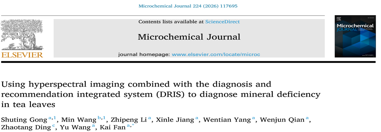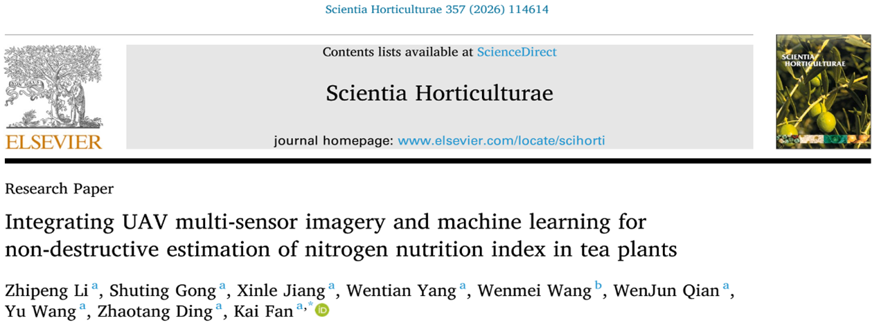 无人机智能施肥技术的示范应用,背后有着坚实的科研理论支撑。近期,范凯副教授团队在国际期刊上发表的两项重要研究成果,为茶园精准管理体系的构建提供了科学依据。由硕士研究生李志鹏发表于 Scientia Horticulturae 的论文,通过融合无人机多源遥感数据与机器学习算法,成功构建了茶树氮营养指数无损诊断模型,为基于无人机平台的变量施肥提供了科学依据,由硕士研究生龚淑婷发表于 Microchemical Journal 的论文,建立了基于高光谱成像的叶片矿质元素反演模型,实现了对茶树多种营养元素的快速、无损诊断,为土壤改良和微量元素补充提供了精准决策依据。